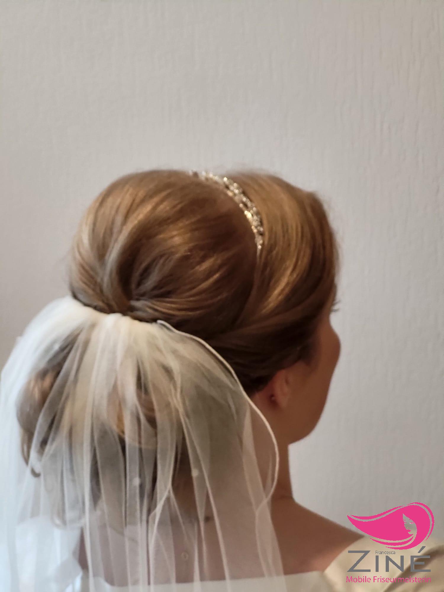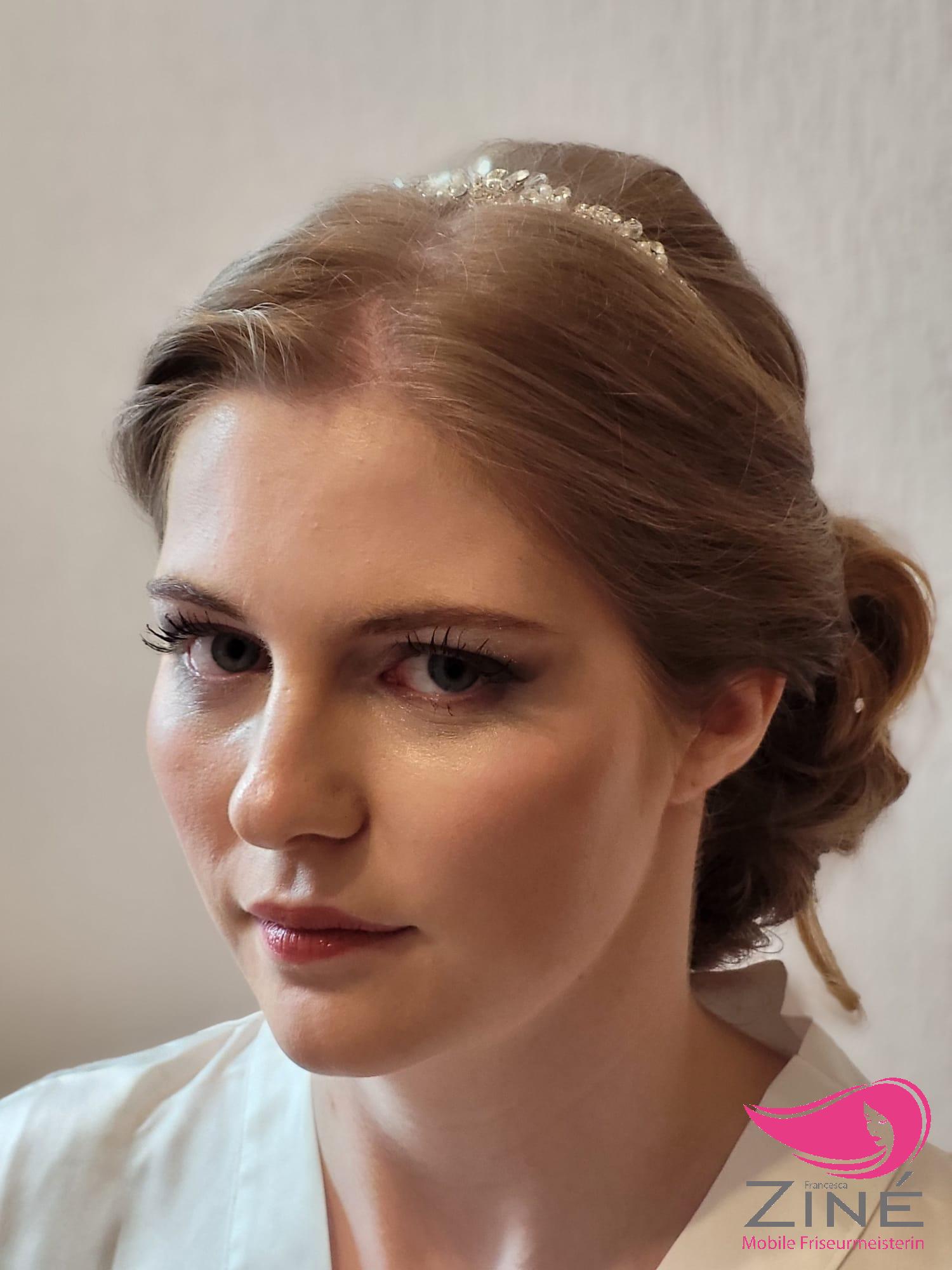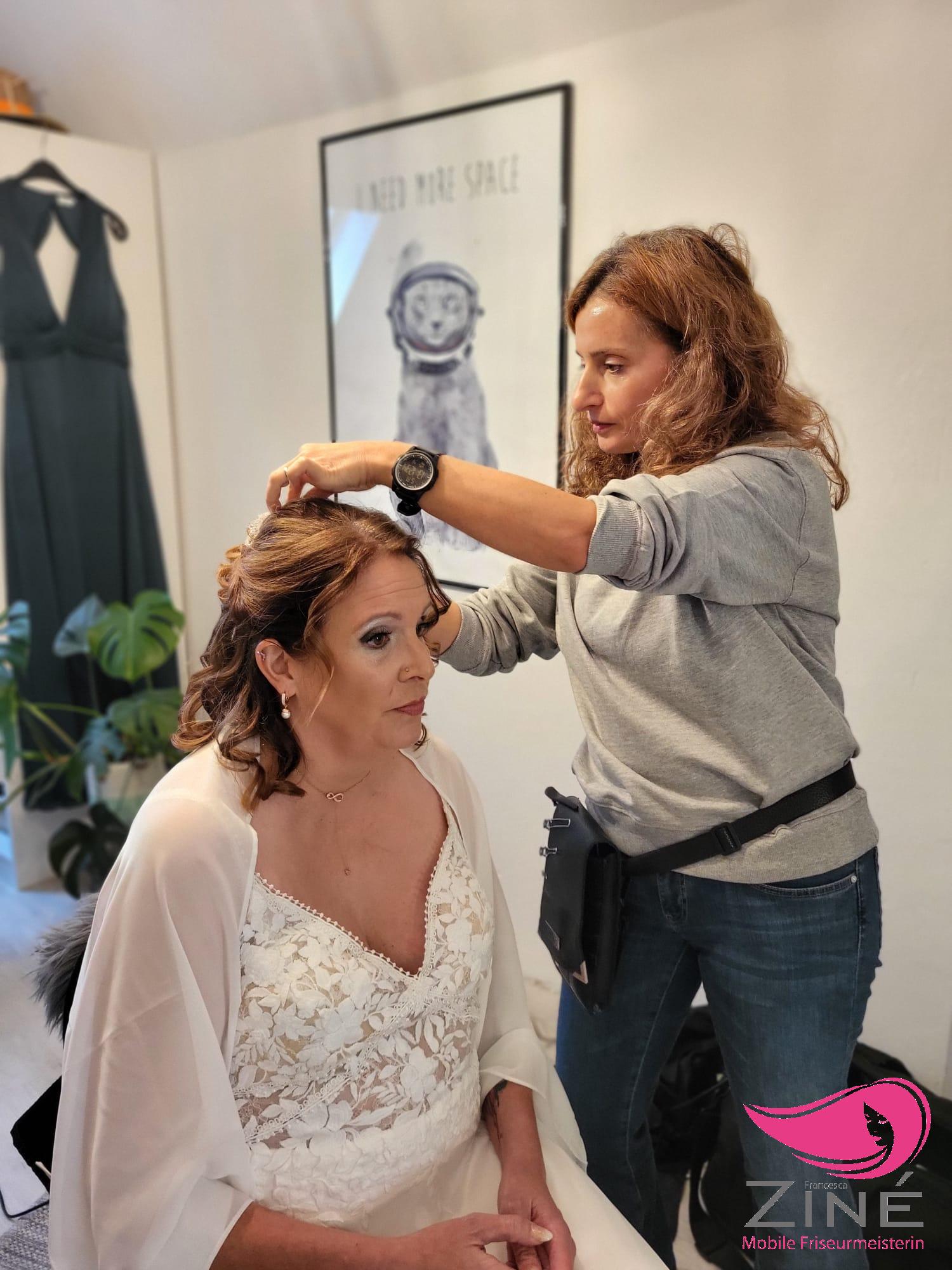 Francesca Ziné - Wir sehen den Kopf einer Braut, bei der die Frieurin ein Perlenhaarband in die Frisur einarbeitet