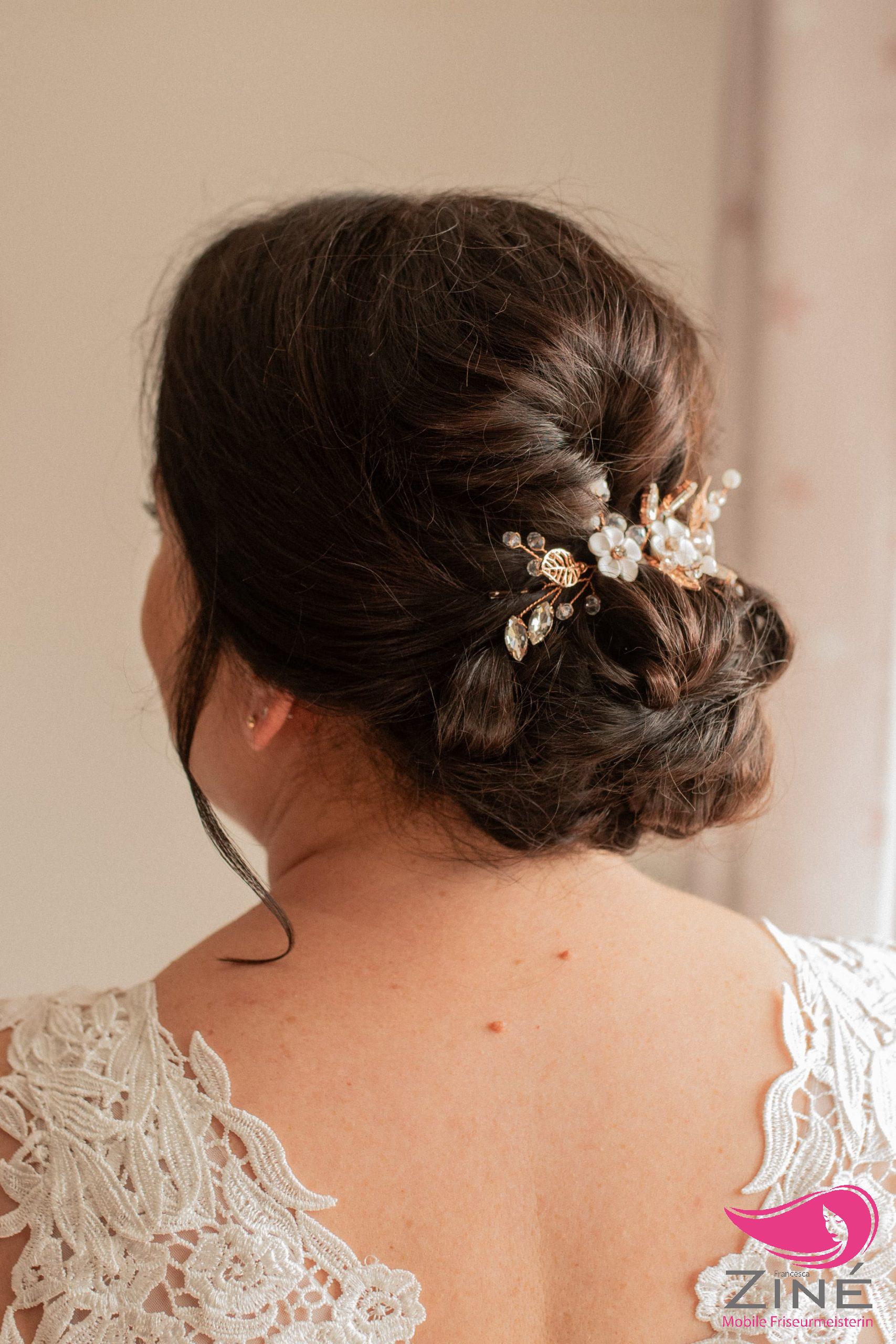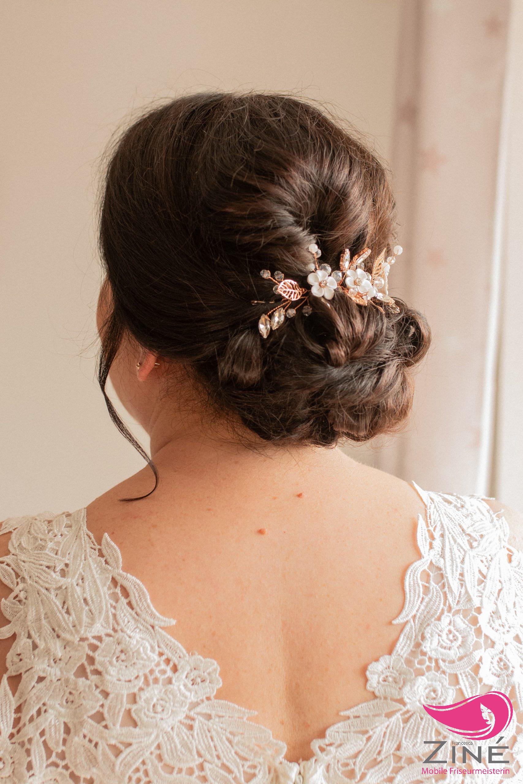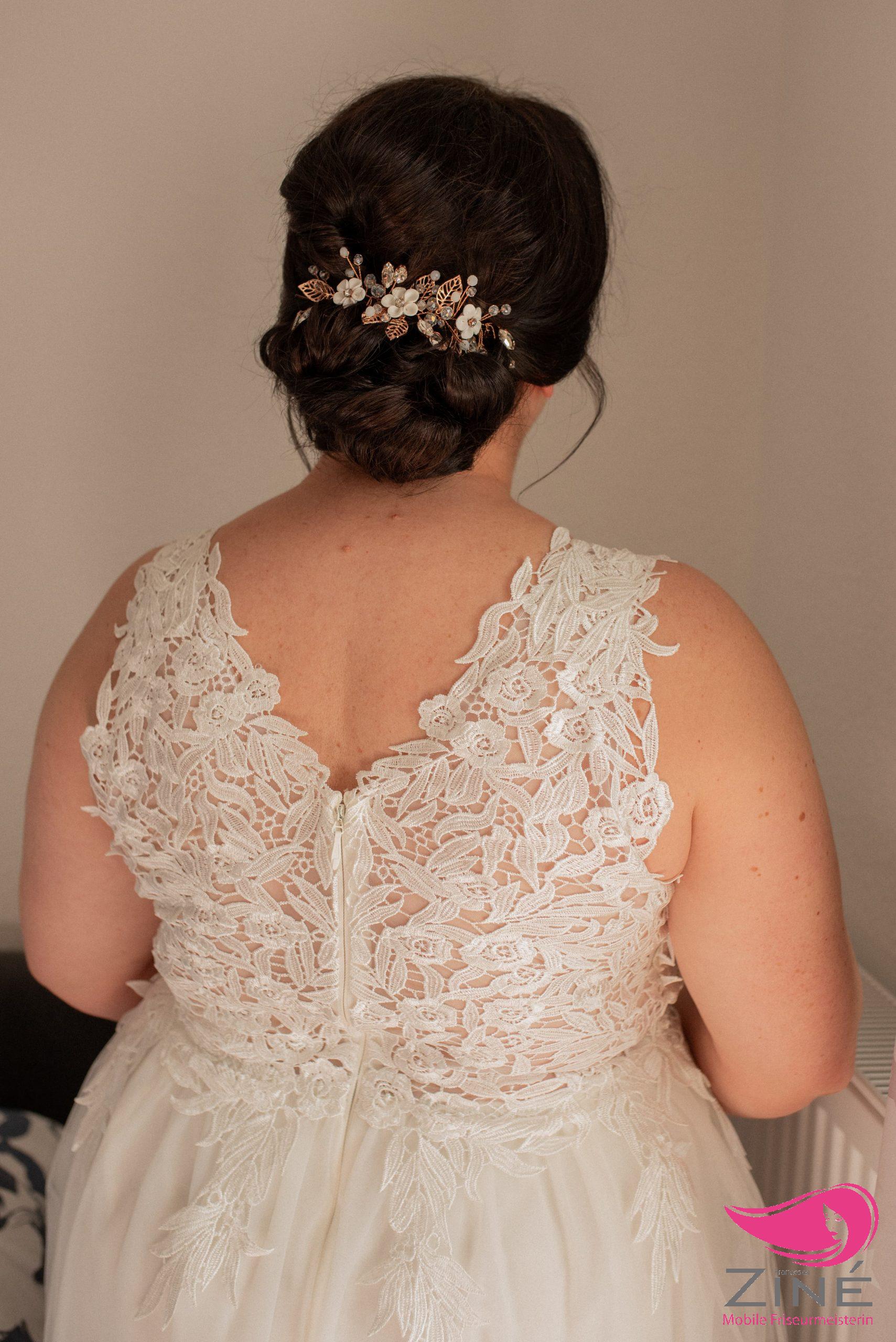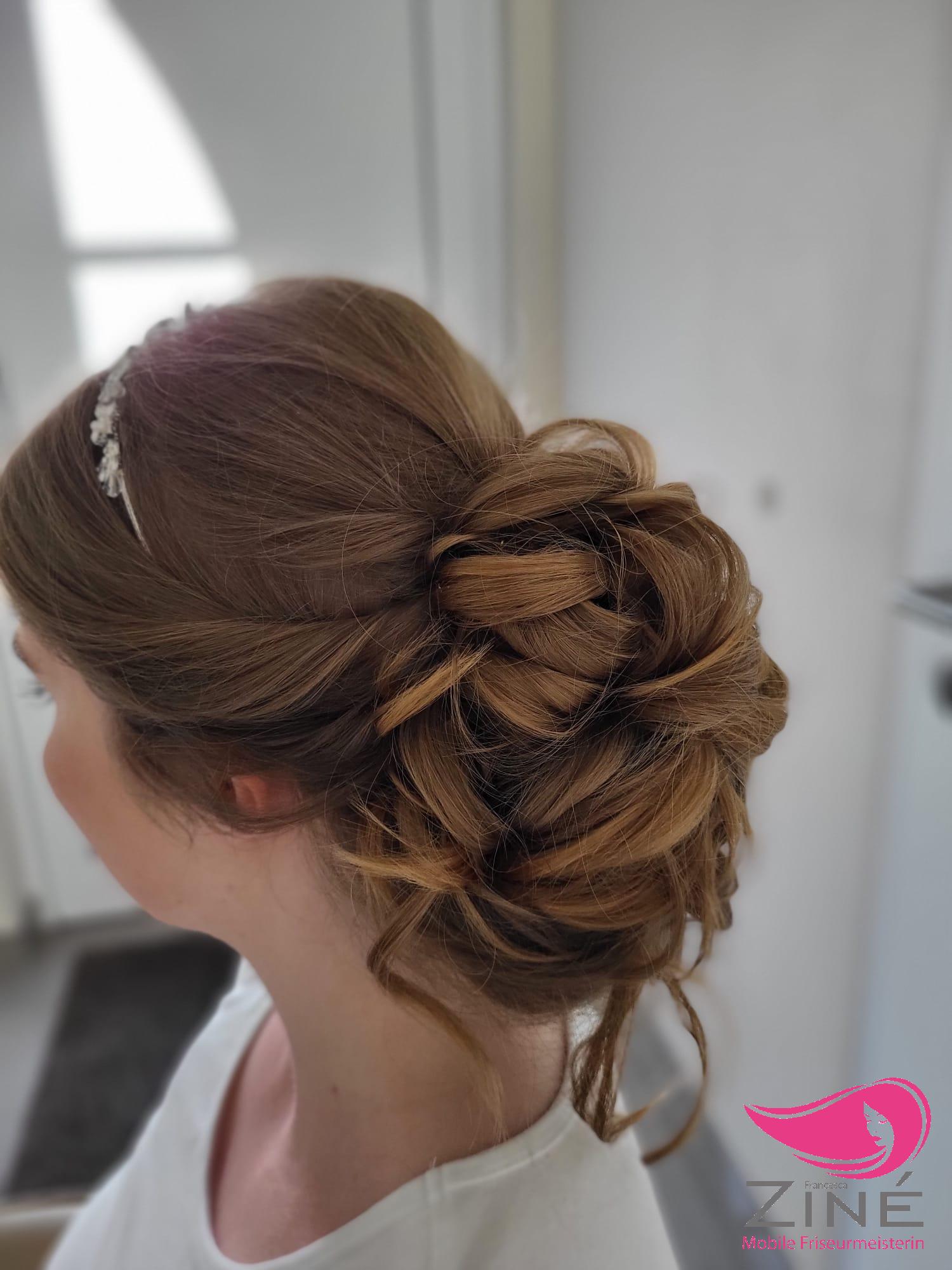 Francesca Ziné - Wir sehen den Kopf einer Braut, bei der die Frieurin ein Perlenhaarband in die Frisur einarbeitet